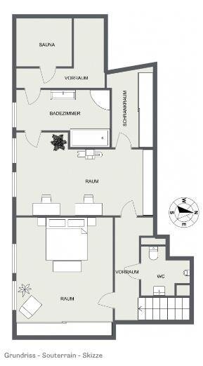 Das Untergeschoss verfügt über ein weiteres WC mit eigenem Pissoir, 2 Zimmer und einen Schrankraum. Der Keller wurde in den Wohnbereich integriert und mit einer Sauna ausgestattet. Hier befindet sich auch der Anschluss für die Waschmaschine.