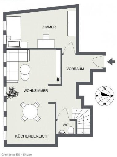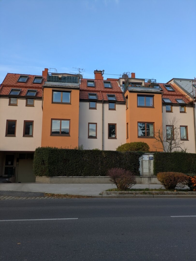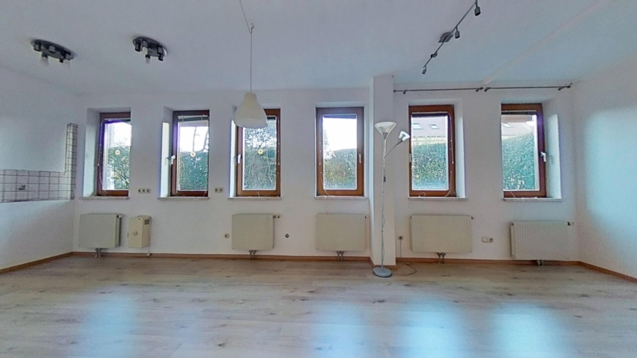 Die zweigeschossige Wohnung liegt in einer kleinen Wohnanlage. Der barrierefreie Eingang befindet sich im Erdgeschoss. Das zentrale Vorzimmer führt rechts in einen als Arbeitszimmer ausgebauten Raum und anschließend in einen großen Wohnraum mit Platz und allen Anschlüssen für eine offene Küche. 2 Fenster im Arbeitsraum und 6 Fenster im Wohnbereich sorgen für ausgezeichnete Belichtung. Neben einem großzügigen WC führen Stufen in die privaten Räume im Untergeschoss.