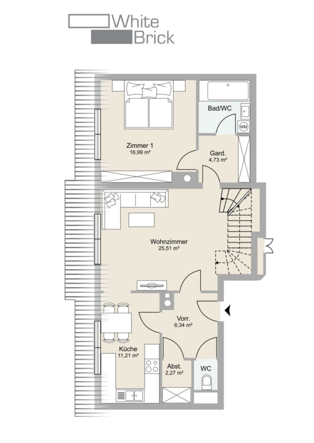 Die praktische Raumaufteilung mit großem Wohnraum sowie drei getrennt begehbaren Zimmern wird sowohl Pärchen als auch Singles begeistern. Die Wohnung eignet sich auch perfekt für eine WG.