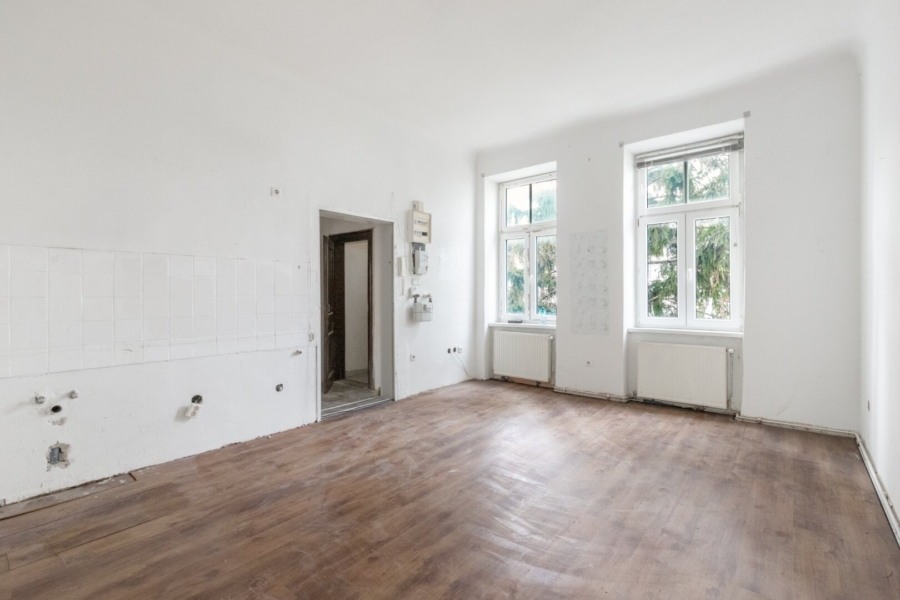 Die praktische Raumaufteilung mit großem Wohnzimmer, sowie zwei Schlafzimmern wird sowohl Singles als auch Pärchen begeistern. Die Immobilie befindet sich in einem sanierungsbedürftigen Zustand. Die Wohnung war früher in zwei kleine Einheiten getrennt wurde allerdings schon grundbücherlich zusammen gelegt, somit ist eine neue Gestaltung der Aufteilung flexibel möglich. Dies macht dieses Objekt zu einem äußerst attraktiven Gesamt-Angebot mit hohem Wertsteigerungspotential.