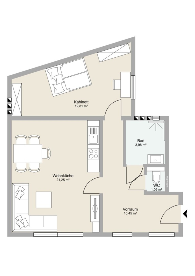 - Wohnzimmer: 21,25m2 (mit Anschlüssen für Wohnküche)